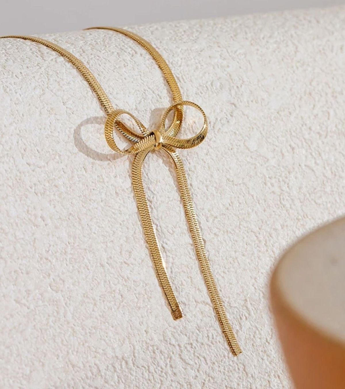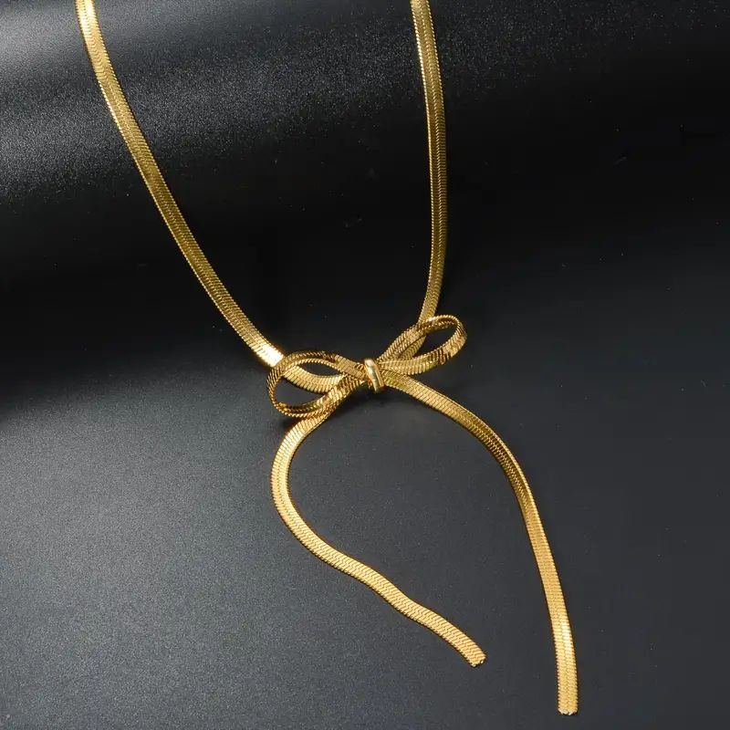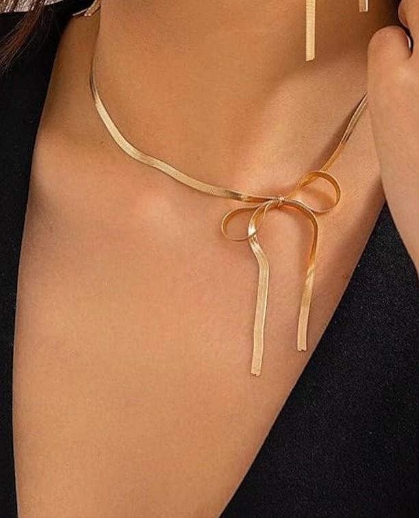 | Add a touch of feminine charm with our Gold Bow Tie Necklace, featuring a sleek ribbon-inspired design crafted in a luxurious gold-plated finish. Perfect for both casual and special occasions, this chic piece brings grace and sophistication to every outfit. |